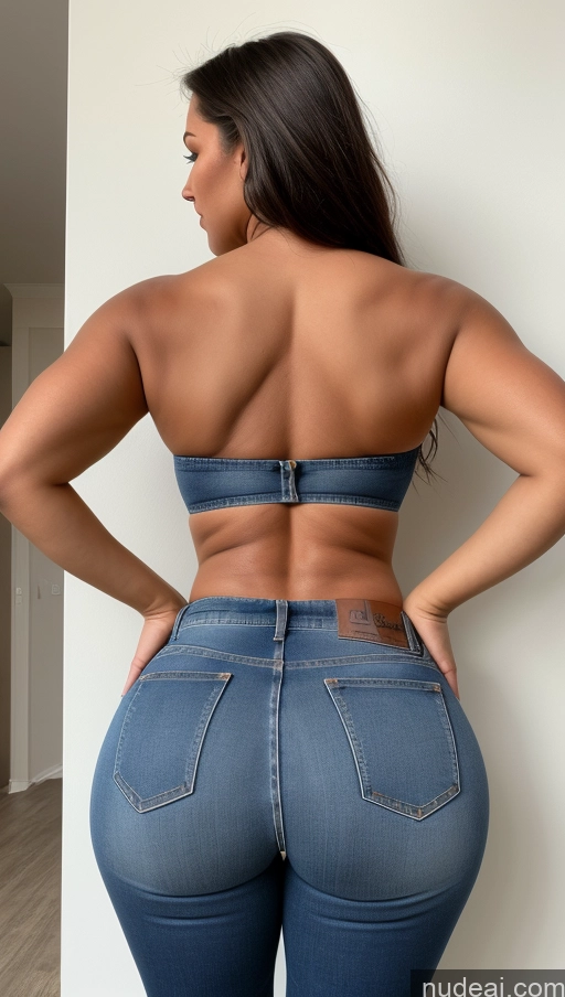 a close up of a woman in jeans standing outside of a building